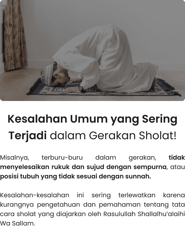 Dengan panduan visual yang mudah diikuti dan penjelasan yang mendalam, VideoBook ini akan membimbing Anda langkah demi langkah untuk melakukan sholat dengan gerakan yang tepat dan penuh kekhusyukan.